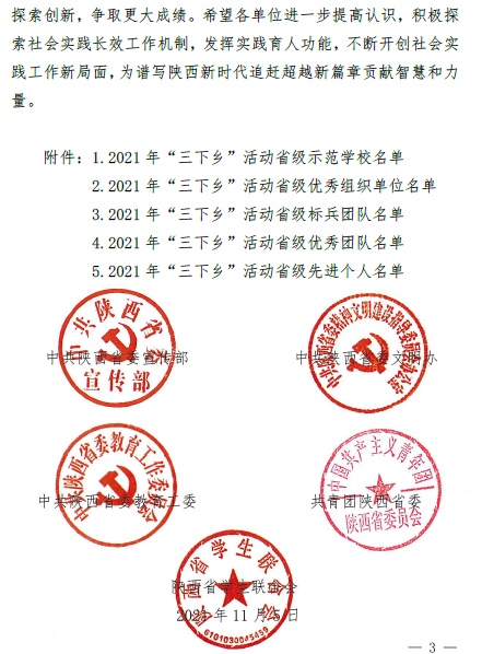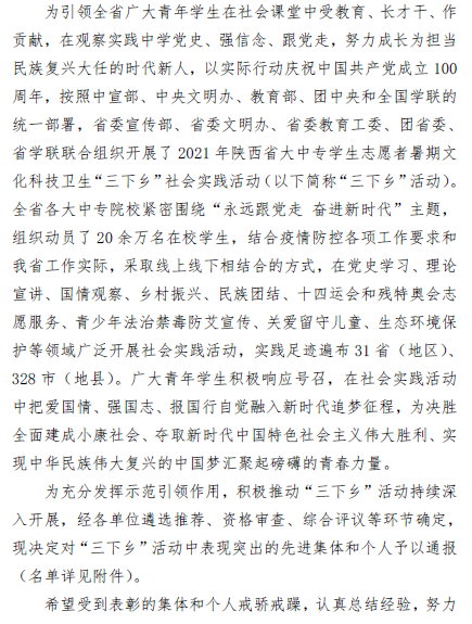日前,中共陕西省委宣传部、中共陕西省委文明办、中共陕西省委教育工委、共青团陕西省委、陕西省学生联合会共同下发了《关于2021年陕西省大中专学生志愿者暑期文化科技卫生“三下乡”社会实践活动先进集体、先进个人的通报》文件。我校荣获2021年陕西省大中专学生志愿者暑期文化科技卫生“三下乡”社会实践活动“省级优秀组织单位”荣誉称号,学校“千声助盲童·万心祝西藏”盲童之光社会实践服务队荣获“省级标兵团队”称号,云横秦岭考察队、“水之心”关爱母亲河社会实践服务队荣获“省级优秀团队”称号,教师鄢盼盼、韩祜生、胡梦妮荣获“省级先进个人”称号。