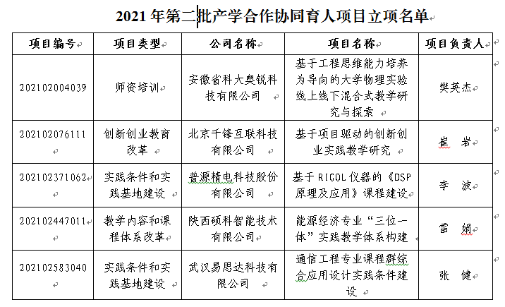 12月14日,教育部高等教育司发布《2021年第二批产学合作协同育人项目立项名单的通知》(教高司函〔2021〕18号),我校5个项目获批立项,立项项目涉及“教学内容和课程体系改革”“师资培训”“实践条件和实践基地建设”“创新创业教育改革”等4个项目类别。截至目前,我校共获批教育部产学合作协同育人项目36项。